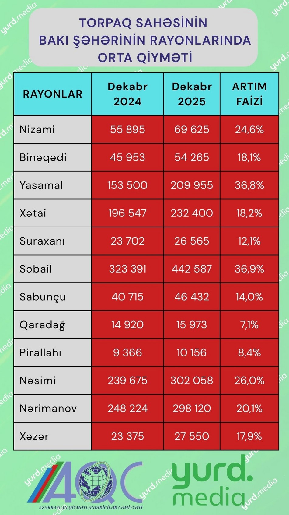 Qeyd edilib ki, ən böyük artım Səbail və Yasamal rayonlarında qeydə alınıb – 37 faizə yaxın. Nəsimi və Nizami rayonlarında torpaq qiyməti bir il əvvələ nisbətən ¼ dəfə, Nərimanov rayonunda isə 1/5 dəfə qalxıb. Ən  zəif bahalaşma Qaradağ rayonunda olub – 7 faizdən biraz çox.