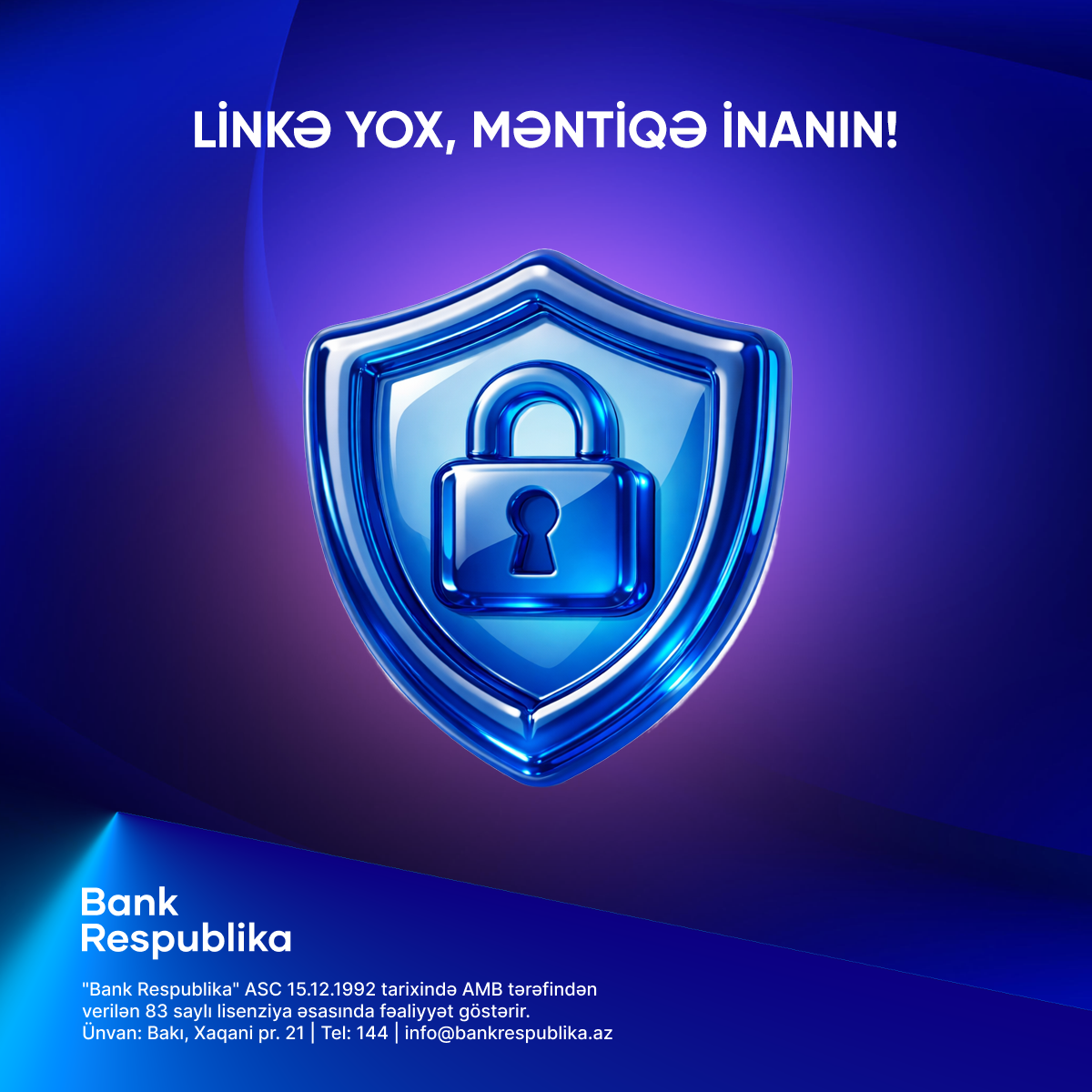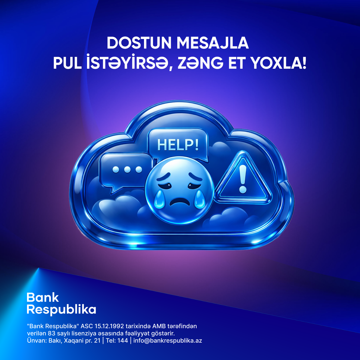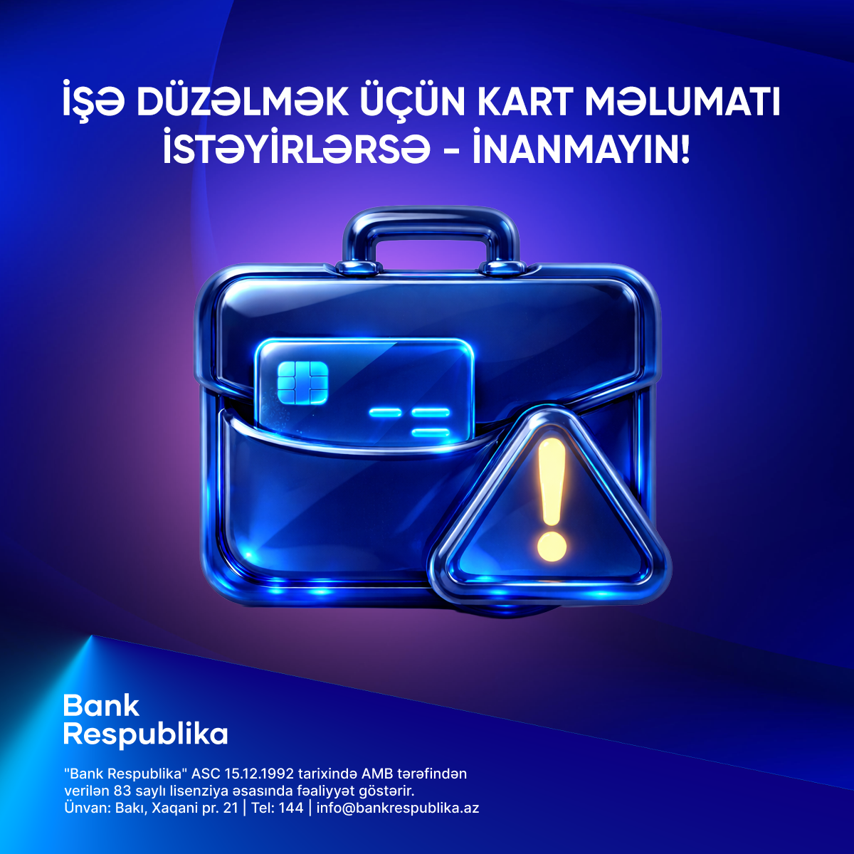 Bank Respublika heç bir halda müştərilərindən telefon, SMS, e-mail və ya sosial şəbəkələr vasitəsilə kartın məxfi məlumatlarını tələb etmir. Şübhəli vəziyyətlə qarşılaşdıqda əməliyyatı dərhal dayandırmaq və bankın rəsmi əlaqə kanalları ilə əlaqə saxlamaq tövsiyə olunur.