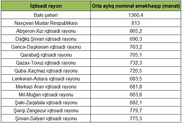 Valyuta.az xəbər verir ki, iqtisadi rayonlar üzrə orta aylıq nominal əməkhaqqı (manatla) aşağıdakı kimidir: