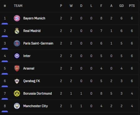 Azərbaycan çempionu ilə yanaşı, Almaniyanın "Bavariya", İspaniyanın "Real", Fransanın PSJ, İtaliyanın "İnter" və İngiltərənin "Arsenal" komandasının da altı xalı var.