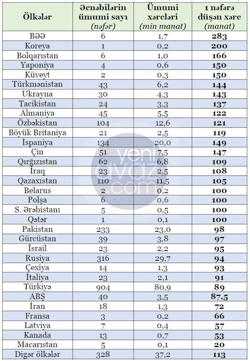 Xərclər baxımından da Türkiyə (80,9 min manat), Rusiya (29,7 min manat), Pakistan (23 min manat), İspaniya (20 min manat), Özbəkistan (12,6 min manat) və Qazaxıstan (11,5 min manat) ön sıralarda qərarlaşıb.