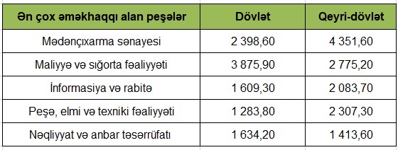 Məlumata görə, mədənçıxarma sənayesində, maliyyə və sığorta fəaliyyəti, informasiya və rabitə, peşə, elmi və texniki fəaliyyət, eləcə də nəqliyyat və anbar təsərrüfatı sahələrində orta aylıq nominal əməkhaqqı ölkə üzrə orta göstəricidən yüksək olub.