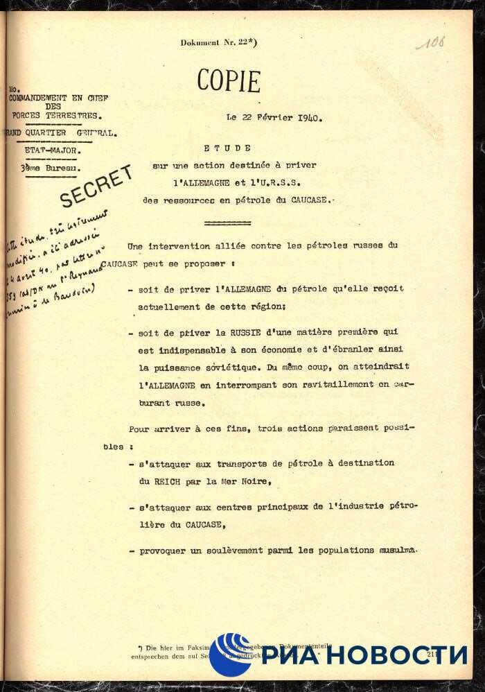Arxiv sənədlərində qeyd edilir ki, 1940-cı ilin martında Britaniya parlamentinin üzvləri Londonun SSRİ-yə zərbə endirmək planlarını pozduğuna görə "qəzəbləniblər". Qeyd edilir ki, Böyük Britaniya və Fransa 1940-cı ilin əvvəllərində SSRİ-yə qarşı münaqişəyə başlamaq, Sovet İttifaqının o zaman müharibə apardığı Finlandiyadan zərbə endirmək, Leninqradı nəzarətə götürmək, Qafqaza zərbələr endirmək, oradakı (Bakıda) neft yataqları dağıdıb məhv etmək niyyətində idilər. Lakin faşist Almaniyasının Qərbi Avropadakı hərbi uğurları, eləcə də Finlandiya-Sovet müharibəsinin martın 12-də başa çatması səbəbindən bu planlar gerçəkləşməyib.