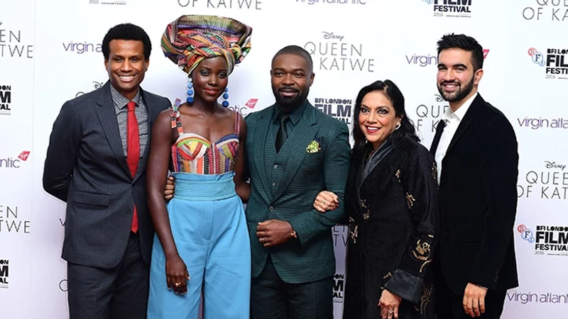 Mira Nair (sağdan ikinci) və Mamdani (ən sağda) "Katwe Kraliçası" filminin tədbirində