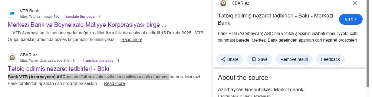 Araşdırmalarımıza görə, bir müddət əvvəl (14 avqust, 2025-ci il tarixində) Azərbaycan Mərkəzi Bankı tərəfindən "Bank VTB Azərbaycan” ASC-nin vəzifəli şəxslərindən birinin qanunvericiliyin pozulmasına görə inzibati məsuliyyətə cəlb edilməsi ilə bağlı rəsmi məlumat yayılıb. Həmin məlumat müəyyən müddət Mərkəzi Bankın rəsmi internet səhifəsində yerləşdirilsə də, sonradan naməlum səbəblərlə saytdan çıxarılıb.